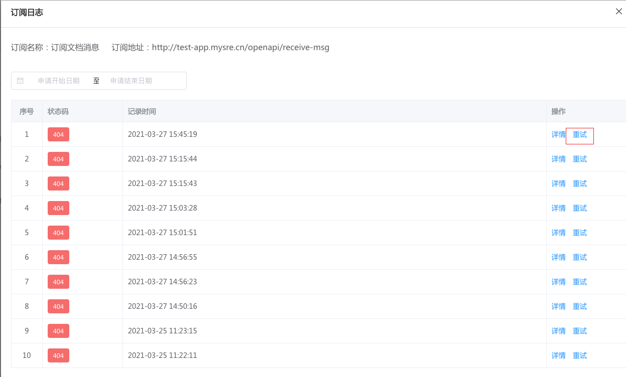 对于失败的订阅可以进行重试(注意:目前系统不保持重试记录):
